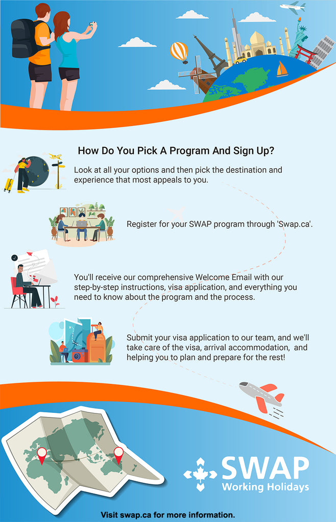 Avons-nous mentionné que les vacances-travail sont des visas uniques qui ne sont disponibles que pour les jeunes jusqu'à un certain âge ? N'attendez pas qu'il soit trop tard pour profiter de ces opportunités uniques d'apprendre, de grandir et d'explorer le monde. Nous savons qu’il peut être effrayant de voyager seul pour la première fois, et encore moins de déménager dans un nouveau pays. De l'assistance en matière de visa et des informations préalables au départ fournies par notre personnel expert avant votre départ, en passant par une communauté de compagnons de voyage et notre personnel local compétent dans votre nouveau domicile, nous sommes là pour vous aider à chaque étape du processus ! Avec autant de pays passionnants à portée de main, de l'Australie à la Nouvelle-Zélande en passant par le Japon ou le Royaume-Uni, il n'y a pas de meilleur moment que le présent pour dire « oui » à l'aventure de votre vie et réserver des vacances-travail avec SWAP !