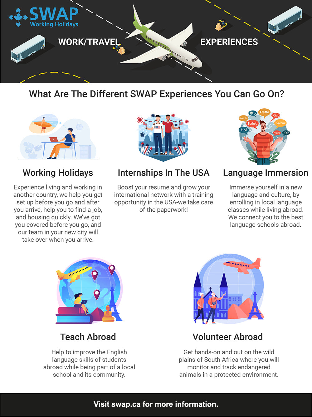 Les vacances-travail sont une catégorie de visa de travail d'un à deux ans offerte aux jeunes Canadiens (âgés de 18 à 35 ans) dans plusieurs pays du monde. Un visa vacances-travail est une excellente opportunité pour votre enfant de vivre à l'étranger et de s'immerger dans une nouvelle culture et une nouvelle communauté, tout en acquérant une précieuse expérience professionnelle.